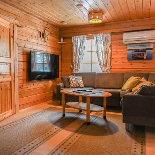 Viihtyisä, omarantainen, tunnelmallinen ja hyvin varusteltu parveton 70 m2 hirsimökki Kuusamossa, Rukajärven rannalla.