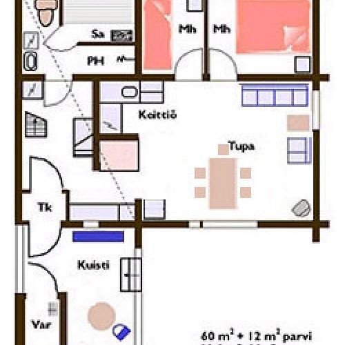 В каждом коттедже 2 спальни (в одной двуспальная, в другой одноместная кровать), кухня-гостиная, мансарда (2 спальных места), туалет, сауна, душ и терраса.