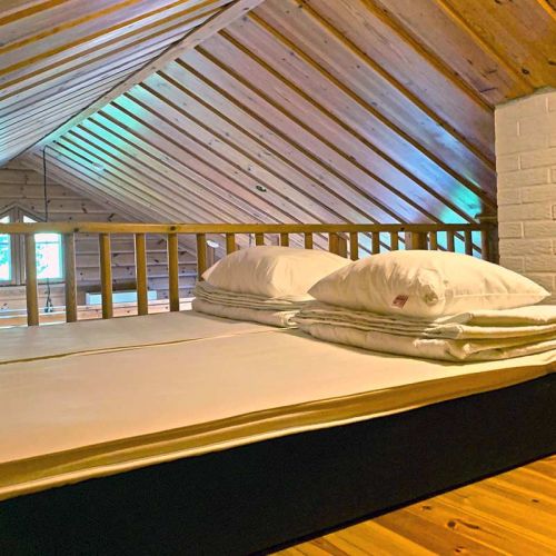 В каждом коттедже 2 спальни (в одной двуспальная, в другой одноместная кровать), кухня-гостиная, мансарда (2 спальных места), туалет, сауна, душ и терраса.